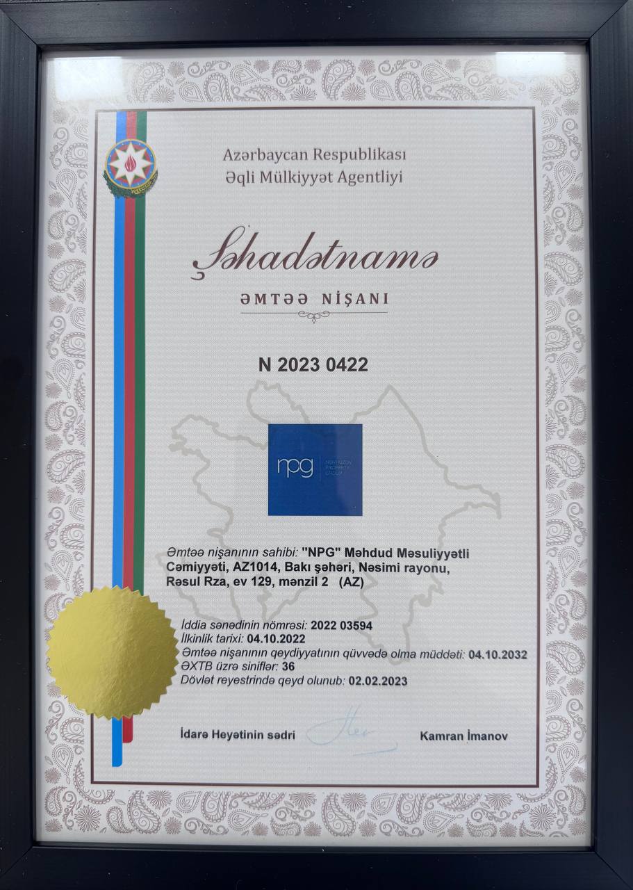 NPG MMC (Daşınmaz Əmlak Şirkəti) əmtəə nişanını (şəhadətnamə) almışdır. Xeyirli olsun.